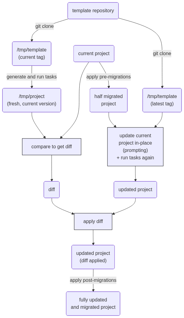 The mechanism is not trivial: it involves extracting and applying diffs (remember, the template and the project are completely separate repos with no shared history). It is summarized in this diagram from the docs: