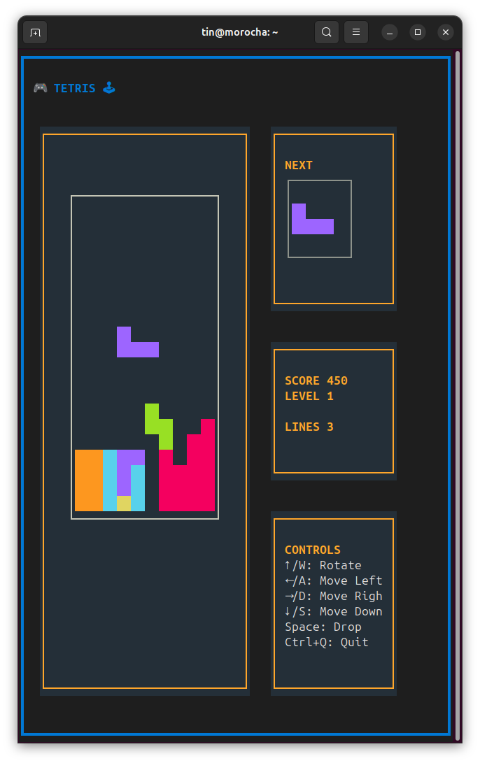 def compose(self) -> ComposeResult: with Container(id="game-container"): yield Label("🎮 TETRIS 🕹", id="title") with Horizontal(): with Container(id="board-container"): yield TetrisBoard(id="board") yield Static("GAME OVER\nPress R to restart", id="game-over-overlay") with Vertical(id="sidebar"): with Container(id="next-piece-container"): yield NextPieceWidget(id="next-piece") with Container(id="score-container"): yield ScoreWidget(id="score-widget") with Container(id="controls"): yield Label("CONTROLS", classes="section-title") yield Label("↑/W: Rotate") yield Label("←/A: Move Left") yield Label("→/D: Move Right") yield Label("↓/S: Move Down") yield Label("Space: Drop") yield Label("Ctrl+Q: Quit")